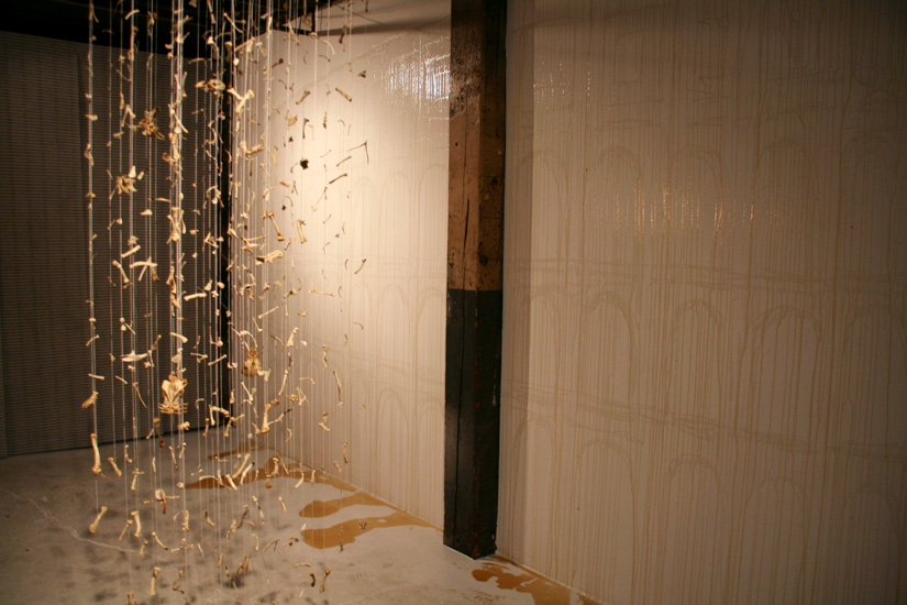Jessica Marion Barr's Augury : Elegy bone sculpture with Gareth Bate's Colony Collapse honey installation. Indicator exhibition: photo: Gareth Bate.