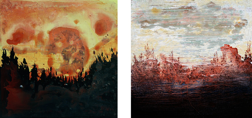 Moments: Aurora Pink Trees, acrylic on wood, 2 Paintings: 8 x 8 inches, Feb.-Dec. 2010, sold.