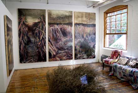 Gareth Bate 2007 Winner of the 401 Richmond Career-Launcher PrizeEvery year a 500 square foot studio is given to one Ontario College of Art & Design graduate for a full year. The award is given by Margaret Zeidler. The beautiful studio (room 260) is located at downtown Toronto's 401 Richmond St. West. In the studio Gareth created the "Lament" Painting Series, Penance Performance and Self-Portrait Installation. 401 Richmond is an old industrial building has been transformed into a vibrant home for artists studios, galleries, film festivals, charities, magazines, tailors, architects, theatre groups, design firms etc. It also has a wonderful cafe. The roof top garden and stunning court yard are secret, (yet public) Toronto gems. The building is based on urban ecologist Jane Jacobs philosophy of "New ideas require old spaces" and the need for mixed use and diversity. Website: 401 Richmond Street West, Toronto