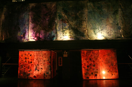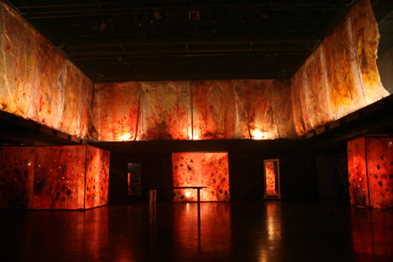Corps IntérieurToronto Artist Gareth Bate makes his Montreal Set Design Debut in Corps Intérieur (Inner Body)Le français ci-dessous... Gareth Bate's ambitious set design installation for "Corps Intérieur" pushes the boundaries of painting, as well as set design, with an immersive environment where the audience descends into a glowing underworld reminiscent of a pulsing inner body. The performance by David Pressault Danse in collaboration with Danse-Cité closes Jan.31st, 09 at the Monument National Theatre in Montreal. In this visceral environment the dancers embody consciousness in an inner world reminiscent of the body's pulsing organs or a womb. The mezzanine section incorporates a massive 200-foot installation created by trapping fluid acrylic paint between textured layers of plastic wrap. On the lower level the audience is invited to wander the space and interact with the dancers. The design incorporates five 10 x 10 foot "peep show" boxes made of painted cotton. They resemble Chinese lanterns painted to evoke cave paintings covered in handprints. The audience peeks through holes to view the dancers inside. Lucie Bazzo provides a stunning lighting design. The extreme set pushes the material restrictions of what is permissible in theatres. The final creation breaks new ground with an elaborate fire proofing protection. The show has been well reviewed in Le Devoir, La Presse, and the Hour among others. Acknowledgments: Ontario Arts Council Emerging Artist Grant. Special Thanks: David Pressault, Armando Gomez Rubio, Angelo Barsetti, François Bricout, Lucie Bazzo and Catherine Viau. MEDIA CONTACT: Gareth Bate CORPS INTERIEUR Dates: Wed-Sat. Jan. 21st - Jan. 31st. 8:30pm With the choreographic participation of the interpreters: Angie Cheng, Anne LeBeau, David Flewelling, Karina Iraola, Karsten Krall, Daniel Soulières COLLABORATORS: Contact: Danse-Cité, 515-525-3595, www.danse-cite.org, into@danse-cite.org BIOGRAPHY Gareth Bate is an emerging Toronto visual artist who works in painting, installation, performance, photography, video and online communication. Gareth graduated with a BFA from OCAD in 2007, where he won several awards for painting including the 401 Richmond Career-Launcher Prize, an all expenses paid 500-sqft studio for a year. He is also a graduate, and now teacher, at The Art Centre at Central Technical School. Gareth has become best known for a viral YouTube video called "Penance for Environmental Destruction" where he crawled along the street with a field of grass on his back, and his "Lament" environmental painting series. Gareth has shown at a number of Toronto galleries including Glendon, Loop, Deleon White, Gladstone Hotel, Canadian Heritage Office, Lonsdale, Gallery 44, Bau-Xi, and participated in Nuit Blanche, Contact and the Queen West Art Crawl. He has been featured in The Toronto Star, Globe & Mail, NOW, L'Express, Metropolitain, Radio Canada, Xtra, Checkerspot Magazine and Le Devoir. Website: http://www.garethbate.com