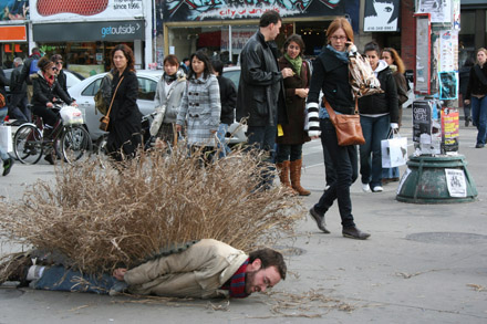 The act of penance is self-inflicted humiliation in the face of intense guilt. In Nov. 2007 Gareth Bate crawled along Toronto's Queen Street West for about 4 blocks on his stomach with a field of grasses on his back. The piece is intended to represent a bizarre act of self-punishment in penance for environmental destruction, like Atlas carrying the weight of the world on his shoulders. The public response seemed mixed between considerable curiosity, confusion, indifference and hysterical laughter.