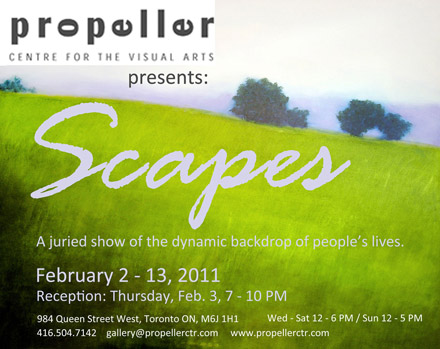 Landscapes reflect the living synthesis of people and place. They are the dynamic backdrops to people's lives. Escape the winter doldrums and show off your landscapes at Propeller's juried group show this February 2 -13, 2011.