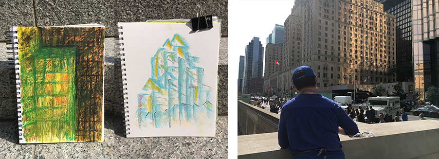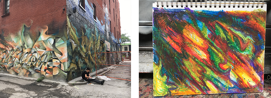 "It was always an adventure. I loved going to unexpected places, and waiting for the secret e-mail made it feel like an episode of Mission Impossible! It was really wonderful to sit in different places in Toronto and interpret them in different ways. It makes you see what’s possible and how your own city gives you a lot to look at. I liked being connected to other like-minded people, in particular the teachers in your class. You’re always so attentive to people when they are working. Creating art makes me feel better about the things that frustrate me. The three hours a week is time that belongs to me to make something I can feel good about. It has been impactful to walk through a door and not really know everything that was going to be on the other side."