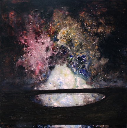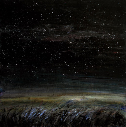 The exhibition features paintings of the vastness of space as if viewed from the earth. Essentially they are landscapes of the cosmos. The parallel subjects meld together, our world and the other. Rather than epic scale works, these paintings are intimate, yet they depict vastness and infinity.